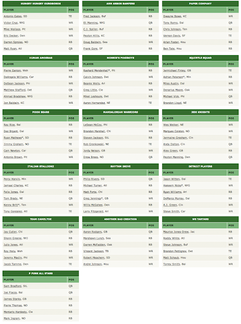 Mandalorian Warriors had a whopping four picks this round: Randy Moss, Santonio Holmes, Isaiah Pead, and Owen Daniels. He's reassembled Holmes and Daniels from last year and secured Steven Jackson's backup in Pead. We call this incredible 2012 draft by Matt the "double bag strategy." Make sure you got a backup plan for any emergency and then be extra safe on top of that. I don't know about you, but I like this safety first method.