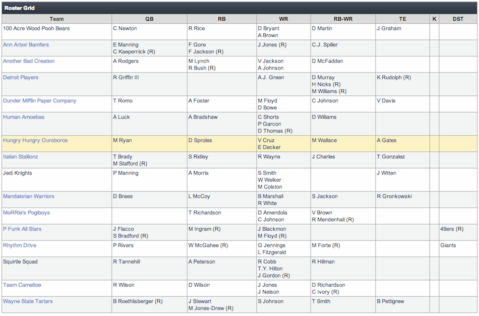 Speaking of handcuffs, Ben Tate, free agent to be, might be an absolute steal here, as Arian Foster is dinged up. Foster now belongs to Dunder Mifflin Paper Company and it would be interesting to see if this is finally Foster's year to stick on a roster. Hungry Ouroboros snapped up Johnathan Franklin for another wild card rookie running back shot.