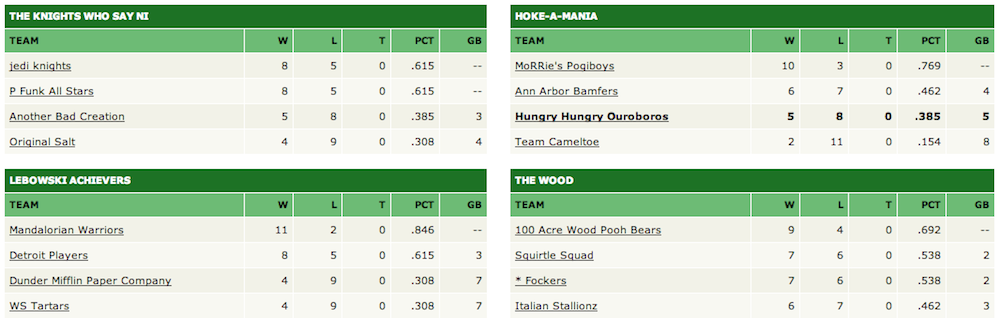 5. Jedi Knights (8-5) - The Knights Who Say Ni Division Champion. Next best overall record.